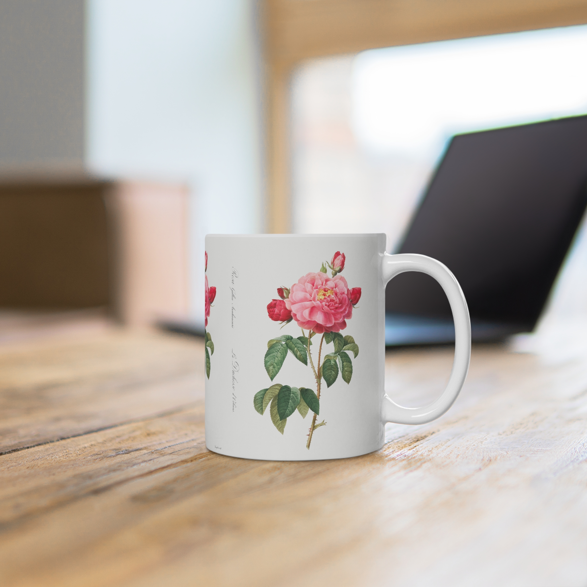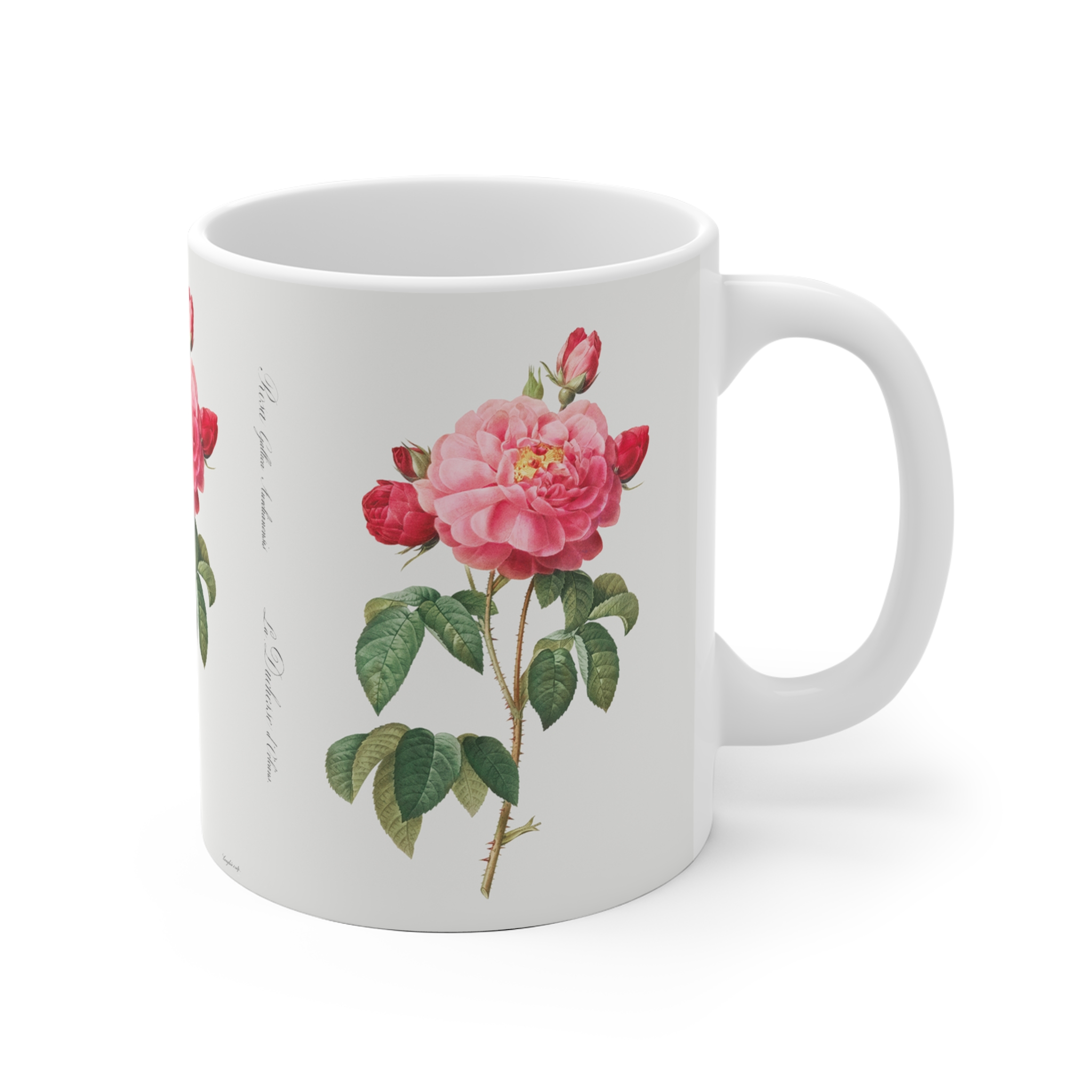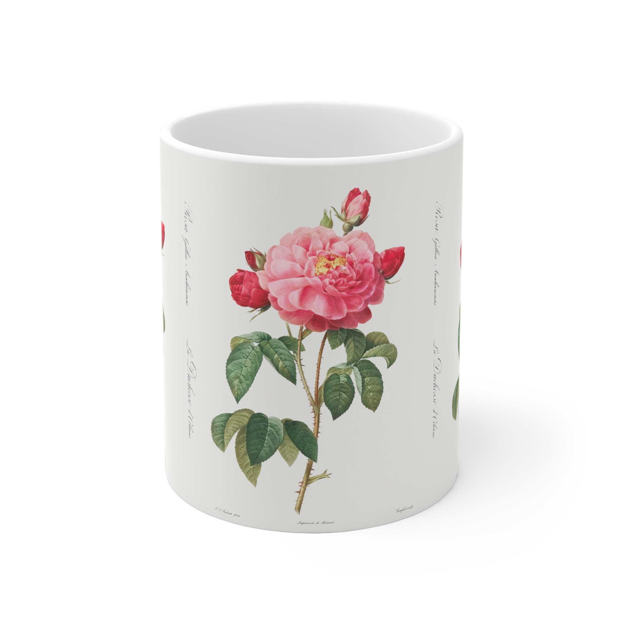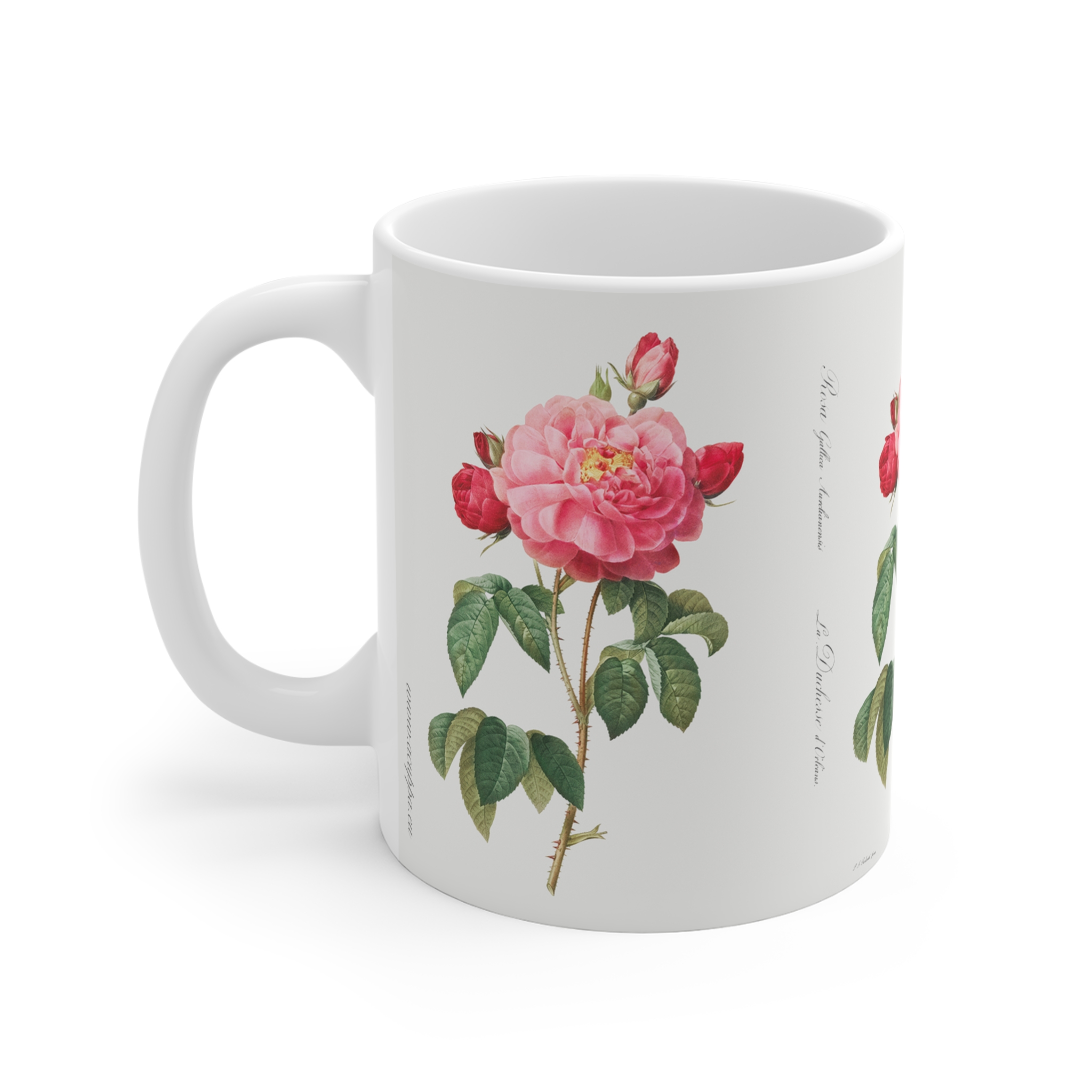Indulge in the classic beauty of our mug with Rosa Gallica “Damascena” pattern.