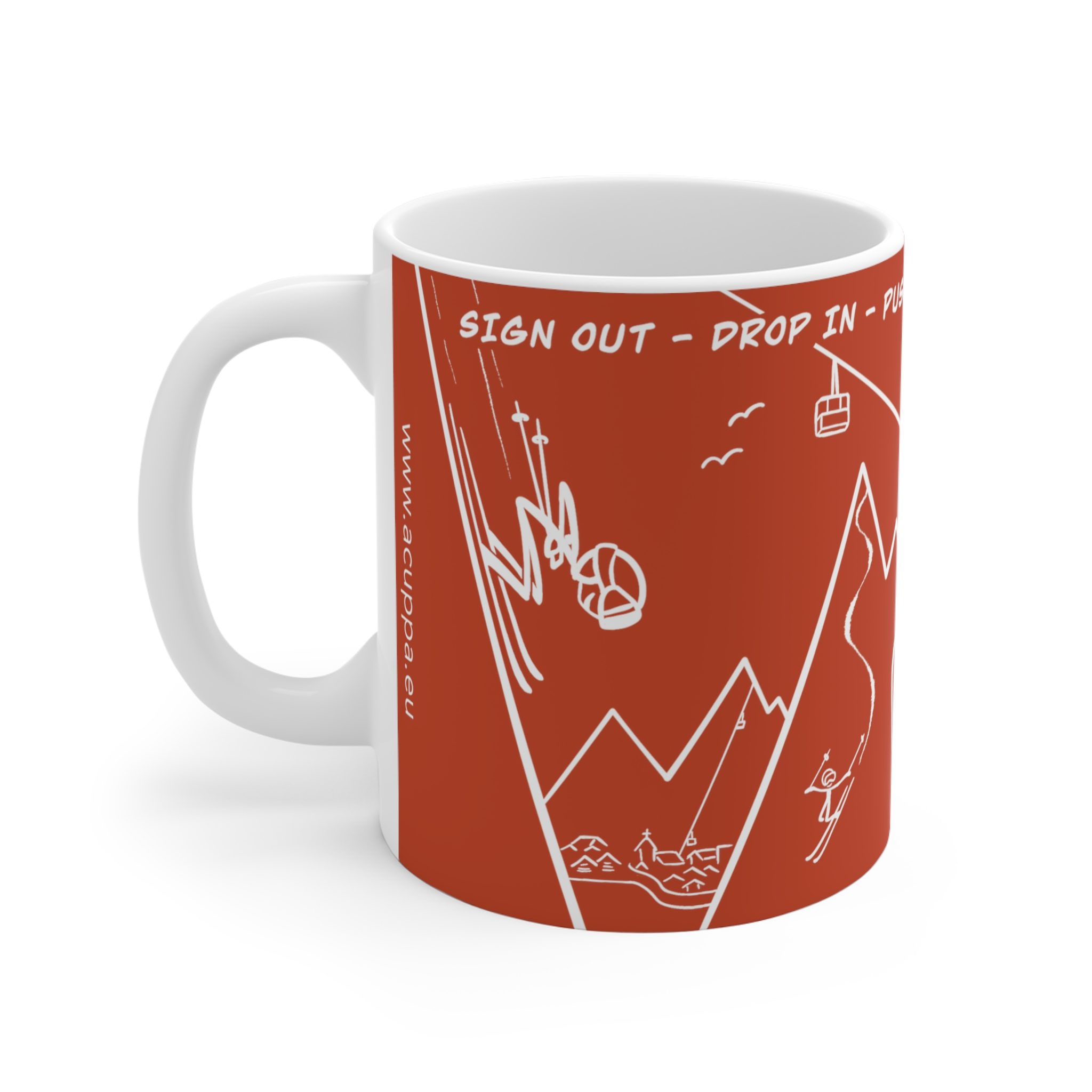 Let the Sign out Skiers Mug accompany your coffee or tea experience in the office. Featuring dynamic sketches this charming and unique mug is not just a fun purchase but also an ideal gift for any skiing enthusiast.