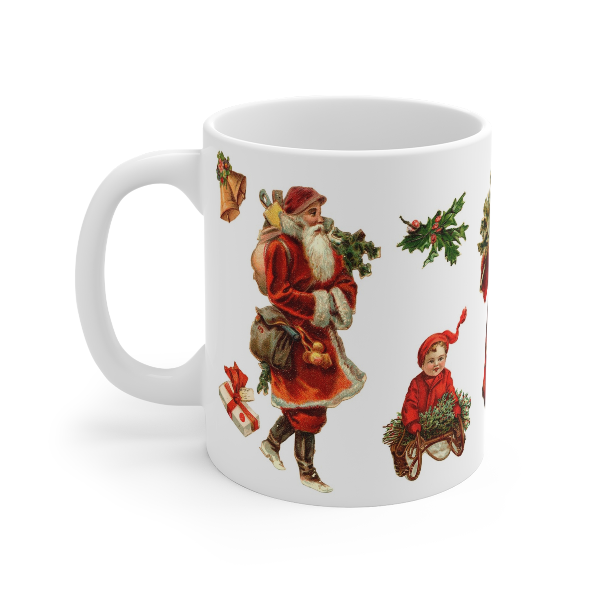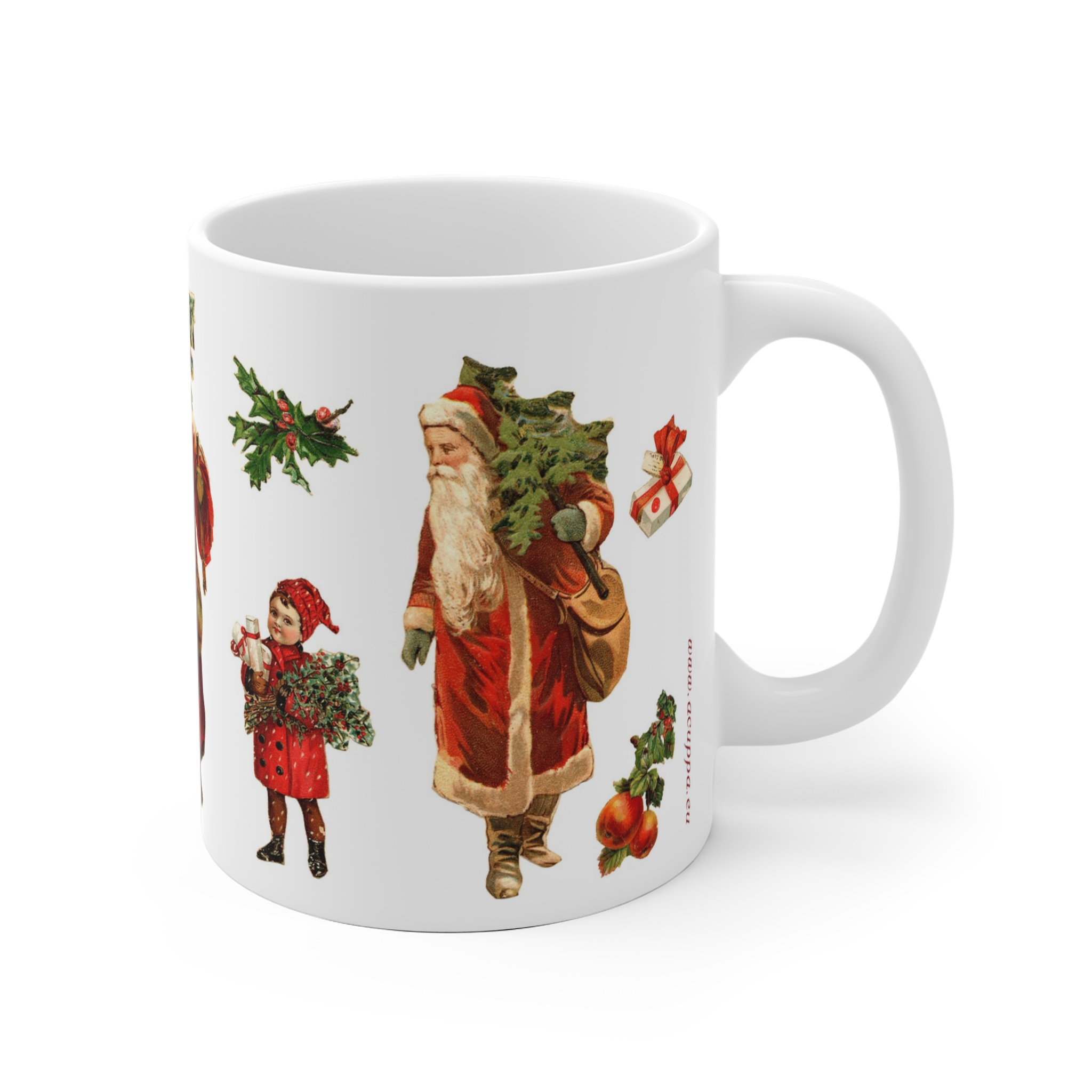 Warmth in your hands and a hint of old-fashioned holiday magic. This white ceramic mug wraps a collage of vintage Santa figures and holly sprigs around its surface, like a page torn from a Victorian Christmas card. Hold it for a slow morning coffee or a quiet evening cocoa; the large C-handle feels steady and comfortable, and the rounded rim makes every sip gentle. The colors stay bright through dishwasher cycles and the mug is microwave-safe, so it fits seamlessly into everyday rituals during the holiday season. This piece speaks to those who love nostalgic decor and cozy moments — a small, tangible take on holiday memories that fits right on the kitchen counter or mantel.